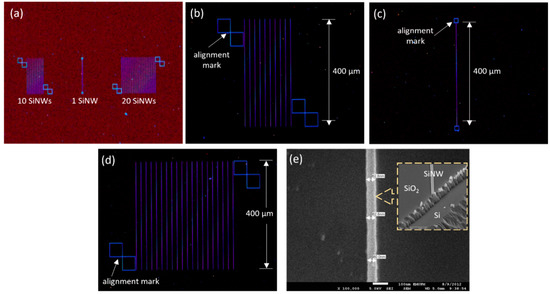 Additionally, to assess the size effect of the SiNWs on the electrical properties, samples with different widths of the SiNWs were fabricated using EBL, by varying the design width of the NW pattern for each exposure. In this context, the number and the length of NWs were fixed, while the width was varied, i.e., 60–100 nm from die to die. After the Si etching process, the corresponding results were characterized using an FESEM image, as shown in Figure S1 of Supplementary Materials. Furthermore, the SOI-based top-down approach produces a rectangular cross-section of nanowire, as shown in the inset Figure 2e. The fabricated SiNW has a height of approximately 50 nm, which corresponds to the top Si layer thickness of the SOI wafer as the starting material. This shows the successful fabrication of horizontal siNWs with good quality.