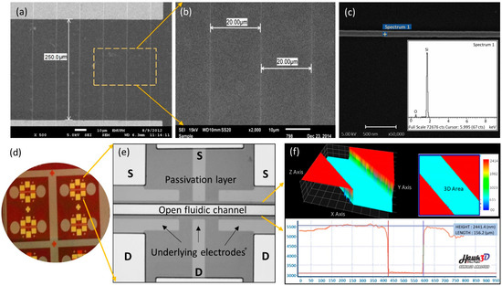 Once the SiNWs have been fabricated, the subsequent step was to form the electrode pad via the conventional photolithography process. Typical FESEM images of the SiNWs arrays are illustrated in Figure 3, showing that the source and drain contact pads are well aligned on top of the individual NWs with 20 µm spacing between the wires. Thereafter, the elemental analysis of the developed SiNWs was determined by the energy-dispersive X-ray (EDX) equipped with FESEM. A peak of silicon (Si) and oxygen (O) with total percentage weights of 77.8% and 22.2%, respectively, were observed on the spotted SiNW, as illustrated in Figure 3c. This thin oxide layer can be chemically modified with APTES and GA, transforming the fabricated SiNWs structure into a functional (bio)sensor device [23]. Figure 3d–f depicts the final view of the device fabricated using Mask 3. The opening windows on the source (S) and drain (D) of the electrode pads as well as the SiNWs channel region are formed well, as observed by the HPM image. The fluidic channels are well-developed with a gap of approximately 150 µm and a passivation layer thickness of approximately 2.5 µm, as illustrated in a three-dimensional view using a surface-profiler image (Figure 3f).