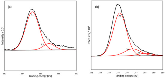 XPS was used to characterize the resulting layers on the silicon surface after modification with APTES (APTES/SiNW) and glutaraldehyde (GA/APTES/SiNW). Bond types formed after chemically modifying the Si surface can be detected using XPS [28]. The C1s orbital signal of the carbon element can be observed at 285 eV. The fitting of the C1s spectra revealed several species on the sample surface (Figure 4). In addition to the hydrocarbon species (C1) that indicated adventitious surface contamination, the presence of the second component (C2) attributed to the C–N and C–O bonds validates the amine functionalization of SiNW using APTES. Furthermore, a new species (C3) that appeared at the peak of 288.05 eV signifies aldehyde group formation (Figure 4b). The highly oxygenated carbon species (C=O and O–C–O) confirmed the effective surface functionality of glutaraldehyde [28,29]. Table 1 lists the binding energy and percentage area of the elements from the C1s spectra.