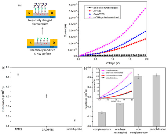 A significant change in the resistance of the device was observed for bare electrical testing and modified SiNW using APTES. The device showed a detectable current value of 1.46 × 10−9 A, in response to the chemically modified with APTES (Figure 7a). It was found that chemical passivation of the NW surfaces using different chemical functional groups (such as –NH2) reduced the band gap of the NW, thus allowing for electrical conductivity. This phenomenon was supported by Byon [40], who claimed that the intrinsic dipole moments of different kinds of linker molecules affect the semiconductor band gap upon their interaction with semiconductor surfaces, can be used to tune electrical properties controllable, and can also be used to overcome doping difficulties for sensors with thin layers in an active region. Then, the current measurement for a GA/APTES surface modification was increased to 2.0 × 10−9 A, pointing to a 40% change of resistance. It was found that the surface termination by aldehyde groups generated a layer of negative surface charge [41], thus accumulating hole carrier in the p-type SiNW surface and resulting in increased current. After the introduction of 1.0 × 10−6 M of probe ssDNA to the GA/APTES modified SiNW surface, the ssDNA immobilization causes a further increment in current flow. The obtained signals are in agreement with the illustration of theoretical predictions, as shown in Figure 7a (left), implying that the attachment of negatively charged ssDNA-probe caused the accumulation of charge carrier (holes) in the p-type SiNW and resulting in the decrease in electrical resistance (Figure 7b).