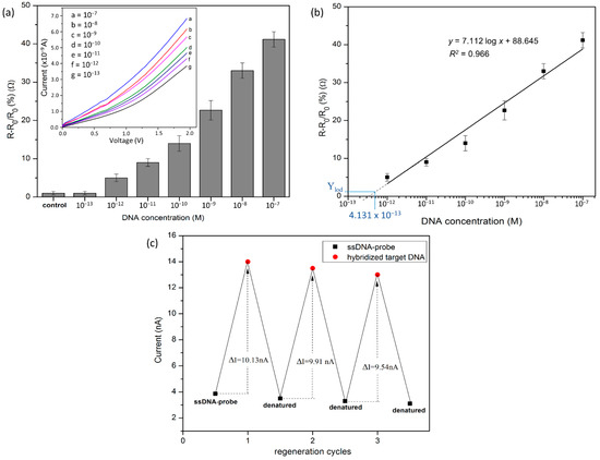 (a) The detection response of the fabricated SiNW device towards different concentrations of fully complementary target DNA. (b) The calibration curve of the resistance changes corresponding to the target DNA concentration range of 1.0 × 10−12 M to 1.0 × 10−7 M. (c) The regeneration of ssDNA-functionalized SiNW.