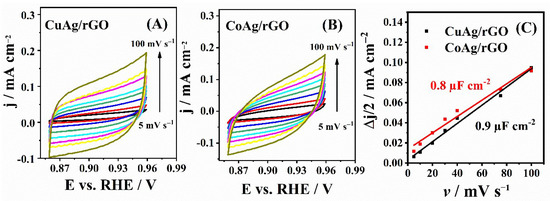Electrochemical double-layer capacitance, Cdl, was calculated from cyclic voltammograms (CVs) of CuAg/rGO and CoAg/rGO electrocatalysts (Figure 4) recorded in N2-saturated 0.1 M KOH solution at different scan rates. Cdl was found to be 0.9 and 0.8 µF cm−2 for CuAg/rGO and CoAg/rGO, respectively, with these values being directly proportional to the electrochemically active surface area (ECSA) [52,53]. The somewhat higher ECSA of CuAg/rGO than CoAg/rGO electrocatalyst represents the higher number of active sites for ORR and HPRR [52,53]. It should be mentioned that high-surface-area rGO contributes to the non-faradaic, capacitive currents and, consequently, affects the accurate ECSA determination. Still, the present ECSA estimation by the Cdl method is suitable for the ECSAs comparison, as both materials contain rGO. Moreover, the Cdl method for estimating alloys’ ECSA considers all the alloy components [54,55].