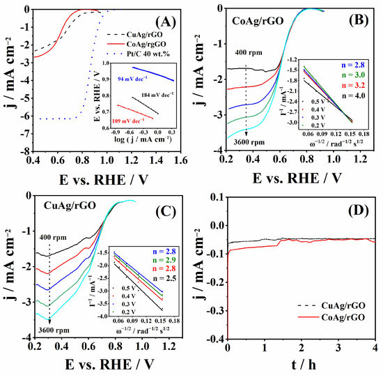 ORR polarization curves of CuAg/rGO and CoAg/rGO electrocatalysts obtained at 1600 rpm in O2-saturated solution are presented in Figure 6A. Eonset and E1/2 were found to be 0.81 and 0.71 V for CuAg/rGO and 0.76 and 0.62 V for CoAg/rGO, respectively. Thus, CuAg/rGO showed 50 and 90 mV more positive ORR Eonset and E1/2, respectively, compared to the CoAg/rGO electrocatalyst. Ag@CuO nanoparticles showed E1/2 of 0.74 V [66], which is ca. 30 mV more positive than the herein examined CuAg/rGO electrocatalyst.