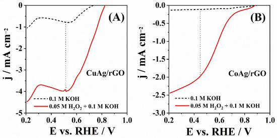 Figure 7 shows LSVs of CuAg/rGO and CoAg/rGO electrocatalysts recorded in 0.1 M KOH solution as a supporting electrolyte in the absence and presence of H2O2. Both materials showed electrocatalytic activity for HPRR with a reduction peak at ca. 0.50 and 0.45 V for CuAg/rGO and CoAg/rGO electrocatalysts, respectively. Carbon paste electrodes modified by Ag-supported carbon microspheres (Ag-CMS/CPE) obtained by the hydrothermal method showed a similar HPRR peak potential value in alkaline media [72]. CuAg/rGO showed a higher peak current density of −3.96 mA cm−2 than CoAg/rGO electrocatalyst (−1.96 mA cm−2).