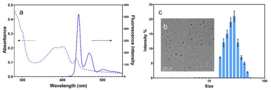 Fluorescence spectra and absorption spectra: (a) TEM image (b) and particle size distribution diagram (c) of PFO-DPC.