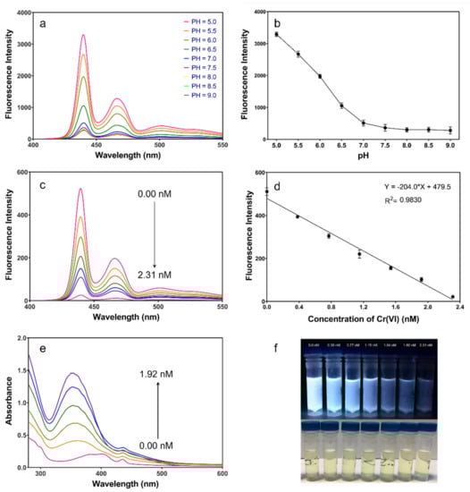 The effect of pH on fluorescence intensity and quenching efficiency was investigated by exploring PFO-DPC at different pH values. In the pH range 5.0–9.0, the fluorescence intensity first decreased (pH 5.0–7.0) and then kept stable (pH 7.0–9.0) (Figure 2a,b). Because the fluorescence intensity remained almost unchanged from pH 7.0 to pH 9.0, the solution at low pH might cause a repulsion effect between Cr (VI) ion and PFO-DPC. In addition, because the design of this fluorescent probe aimed to apply for determination of Cr (VI) ion in the water environment and even the physiological environment, pH 7.0 was selected for the fluorescence detection of Cr (VI) ion.