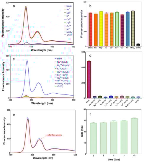 Fluorescence spectra of PFO-DPC with various metal ions in the absence (a) and presence (c) of Cr (VI) ion. Fluorescence response of PFO-DPC (emission 440 nm) with various metal ions in the absence (b) and presence (d) of Cr (VI) ion. The fluorescent stability of PFO-DPC (e). The structural stability of PFO-DPC (f).