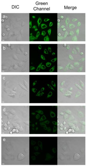 Confocal fluorescent images of HeLa cells after incubating with PFO-DPC and continuous exposure of exogenous Cr (VI) ion source treatment (0.00 nM (a), 0.38 nM (b), 0.77 nM (c), 1.15 nM (d) and 1.54 nM (e)). Scare bar = 10 µm.