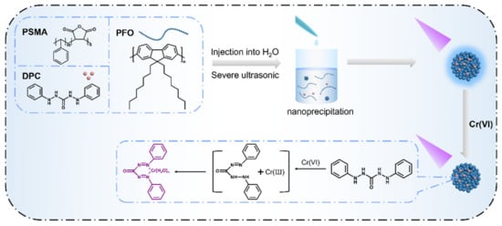 Fluorescence assay has attracted much attention due to its convenience, rapid detection process and relative cost-effectiveness [10,11]. Some reports have focused on the fluorescent methods of Cr (VI) ion detection using different fluorescent materials such as carbon dots [12,13], metal organic frameworks [14], organic complexes [15] or boron carbon oxynitride [16]. However, there are a few reports about the detection of Cr (VI) ion using semiconducting polymer dots (Pdots) as fluorescent probes. Pdots exhibit high absorption cross sections, good photostability and particularly fluorescence brightness that can be magnitudes higher than that of organic dyes and tens of times greater than that of quantum dots [17,18]. Thus, fluorescent sensors based on Pdots have been greatly designed and prepared [19,20]. Moreover, the low toxicity and remarkable biological compatibility of Pdots have attracted researchers to utilize them in biomedical fields such as drug delivery [21,22,23], bioimaging [24,25] and biosensing [26,27]. Diphenylcarbazide (DPC) is frequently reported as a Cr (VI) ion indicator, which is based on the reduction of Cr (VI) ion to Cr (III) ion while DPC is oxidized to diphenylcarbazone (DPCA) at the same time, and then Cr (III) ion and DPCA would form a purple-colored complex. The typical DPC method is the colorimetric method [28,29], and the combination of DPC reagent and the other method has been also explored. Recently, Zhi et al. reported a Rayleigh scattering spectral probe consisting of DPC and liquid crystal trans for Cr (VI) ion detection in aqueous solution [30]. However, to our knowledge, the DPC reagent has been barely utilized to construct fluorescent probes for sensing Cr (VI) ion.