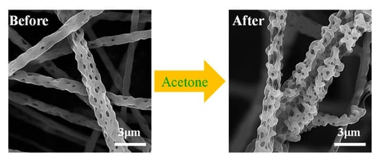 - Nayani, K.; Katepalli, H.; Sharma, C.; Sharma, A.; Patil, S.; Venkataraghavan, R. Electrospinning Combined with Nonsolvent-Induced Phase Separation to Fabricate Highly Porous and Hollow Submicrometer Polymer Fibers. Ind. Eng. Chem. Res. 2011, 51, 1761–1766. [Google Scholar] [CrossRef]