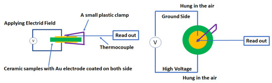 Direct ECE measurement was carried out in this study. To directly measure the ECE signals, a pulsed electric field was applied to the sample with a thermocouple (Precision Fine Wire Thermocouple, Omega Engineering, Inc., Norwalk, CT, USA) attached directly to record the temperature variation as shown in Figure 1.