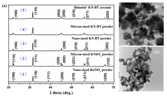 (a) XRD patterns of the (1–4) powders: (1) the commercial nano-sized BaTiO3, (2) micron-sized KNbO3, (3) nano-sized KN-BT(9/1) matrix powders, and (4) micron-sized KN-BT(9/1) filler powders, including (5) XRD pattern of the bimodal structured KN-BT(9/1) bulk ceramic. (b,c) TEM images of the micron-sized filler and nano-sized matrix powders calcined at 900 °C respectively.