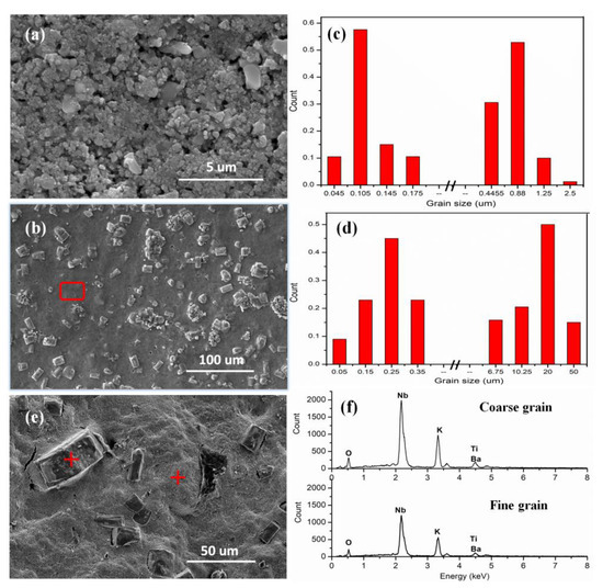 As observed in Figure 2b,c, the micron-sized KN-BT(9/1) powder, as the filler, consists of the irregular crystalline particles with grain sizes of about 200–500 nm, while the nano-sized KN-BT(9/1) powders, as the matrix, are characterized by uniform rectangle crystalline particles with an average grain size of about 100 nm.