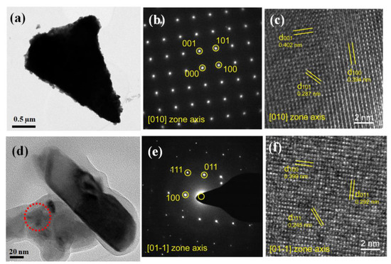 HRTEM images and SAED patterns of the coarse grain (a–c) and small grain (d–f). The bimodal structured KN-BT(9/1) bulk ceramic sintered at 1050 °C was selected for the analysis. Notes: the lattice planes 001, 101, 100 in [010] zone axis respectively in (b); as well as the lattice planes 111, 011, 100 in [01-1] zone axis respectively in (e).