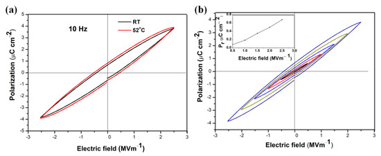 Figure 6a shows P-E hysteresis loops of the KN-BT(9/1) bulk sample sintered at 1050 °C measured at RT and 52 °C at 10 Hz. Figure 6b illustrates P-E curves measured at different electrical fields, while the curve of the remanent polarization versus the electric field at RT is shown as the inset in Figure 6b.