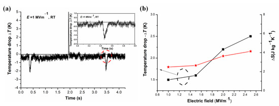 ECE adiabatic ∆T refers to the temperature drop induced after removing the electric field. The typical thickness of the KN-BT(9/1) bulk sample used in the ECE measurement was 0.264 mm with an electrode diameter of 6 mm. The specific isothermal entropy change, S, is calculated withS = c, where c is the specific heat of the ceramic sample [26]. Figure 7a shows the directly recorded ECE signal of the bulk sample at RT at 1 MV·m−1, where the temperature is demonstrated to rise and drop as the field is applied and removed. The T and S at RT at different electric fields are presented in Figure 7b. The ratios of and (or Δ, where ) are used to express the electrocaloric coefficients (ECE strengths). It is found that the KN-BT(9/1) ceramics have high ECE at E = 1 MV·m−1, corresponding to T = −1.5 K and S = 2.48 J·kg−1·K−1. Accordingly, = 1.50 × 10−6 K·m·V−1 and = 2.48 × 10−6 J·m·kg−1·K−1·V−1 were obtained at RT. As discussed above, the strongly widened phase transition temperature near RT is responsible for the giant ECE response over a relatively broad temperature range [4,5].