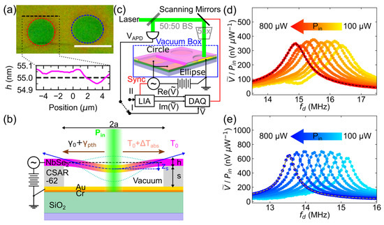 Measurement setup and device. (a) Optical micrograph of the circular (red dashed circle) and elliptical (blue dashed ellipse) drumhead resonators under study. The white scale bar corresponds to a length of 10 m. The black dashed line on the micrograph represents the average thickness of the NbSe2 flake as measured by the Multilayer Interference Approach. (b) Schematic diagram of laser-induced photothermal heating of an electromotively driven drumhead resonator. Cross-section showing the net tension exerted by the drumhead resonators under photothermal heating at the middle of the drumhead. (c) Optical interferometric setup used to track the mechanical frequency of multilayered NbSe2 flake mechanical resonators. Measured driven mechanical responses of circular and elliptical drumhead resonators at increasing incident laser power are shown in (d,e), respectively. The data are represented with dot markers connected with lines. The devices are electromotively driven at V and V. The rightmost colored responses in (d,e) represent the driven responses resolved at the lowest incident powers . The consecutive responses darken with increasing . Dashed lines refer to the driven resonator fits.