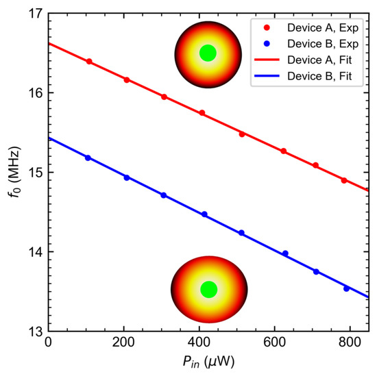 The negative values shown in Figure 3 imply that both devices A and B undergo heat-induced compression. Device A has kHz W for = 13nm. Device B has kHz W for nm. The ratio of between device A and device B in Figure 3 yields 2.23, which is close to the value of 2.16 obtained from the theoretically derived expression , where is the eccentricity factor from reference [54]. The results imply that the difference in of these two drums lies with geometry [8]. Physically, the compressive strain translates to an out-of-plane radial expansion of the drumhead when aided with . is controlled either through electromotive driving of the drumhead [3,55,56] or through slack [8,57,58]. Given the nature of the transfer process using PDMS disks [8,37], likely originates from slack.
