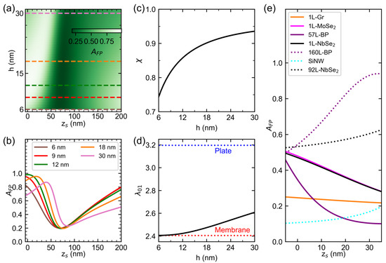 Dependence of the displacement-dependent Fabry–Pérot absorbance profile of drum NMRs on the drum thickness and displacement from equilibrium for various resonator materials. (a) Intensity color map of the calculated dependence of of bulk NbSe2 on thickness and displacement from equilibrium. Colored dashed lines correspond to the profiles plotted in (b). Dependence of the absorbed power fraction (c) and fundamental mode constant (d) of bulk NbSe2 resonators on thickness. (e) Simulated profile for different materials. The FP absorbances were simulated for the Fabry–Pérot structure of device A.