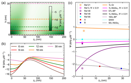 We note that the curve of monolayer (1L) NbSe2 in Figure 5c represents an upper bound by assuming a clean device (). These conditions result in a greater magnitude and larger tuning range of of the monolayer NbSe2 than of other devices such as 165nm thick, clamped-free silicon nanowire (SiNW) resonators [66] (cyan, solid line), graphene (1L-Gr) (orange, solid line), cryogenically-cooled monolayer diselenide (1L-MoSe2) (purple, solid line) and multilayer black phosphorus (BP, magenta solid and dotted lines) drums. The shape of these is reflected in their corresponding dependencies as shown in Figure 4e, which uses the substrate and of device A. For the properties of the above-listed materials that define the magnitude of , see Tables S1 and S2 of the Supplementary Materials. Note that the profiles for BP resonators assume an average, isotropic and even though these resonators have reported anisotropic properties [48]. The indicated materials have positive which implies that the devices made of these materials experience compression upon the illumination by the laser beam. Only the curve of graphene experiences tension upon spot heating due to graphene’s negative at ambient temperature. Furthermore, the SiNW device falls under the optically-thick, bending regime, which illustrates the near-zero magnitude and tunability of with .