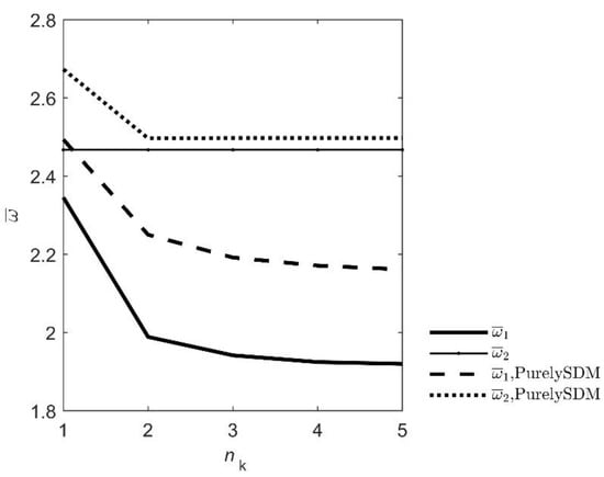 At the beginning of the numerical analysis it is necessary to define the number of pressure field mode shapes (nk) needed for the convergence of the results. The first part of this example deals with this issue. The beam length is L = 100 nm, the thickness F = 3.85 nm, the mass density = 2600 kg/m3 and density of fluid is = 1000 kg/m3 (water), so dimensionless parameter mass ratio of water to beam is γ = 10. Width of the beam is W = 10 nm and modulus of elasticity is E = 160 GPa. The linear free surface waves are not considered, i.e., p(x,y = H,t) = 0. Water is compressible and the speed of sound is c = 1439 m/s. The beam is completely immersed in water and there is no tip mass. Solutions in this and other examples were obtained by the aid of Wolfram Mathematica software. Possible numerical ill-conditioning didn’t appear [23].