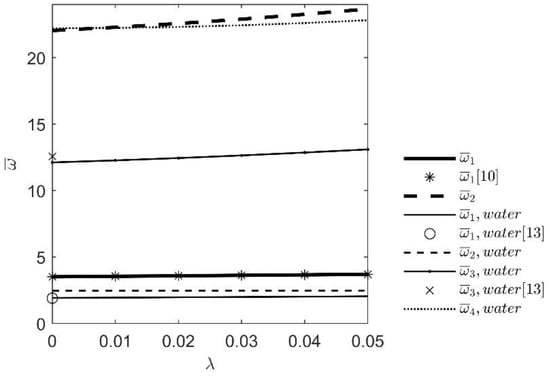 The analysis of the influence of the dimensionless nonlocal parameter (0 ≤ λ ≤ 0.06) on eigenfrequencies of defined beam with and without surrounding water follows. The results are shown in Figure 3 and Table 2.