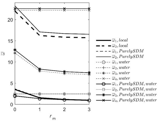 In Example 3.2, the effect of tip point mass on the free end of the dry beam and the beam immersed in water is analyzed using the local and nonlocal theory. The geometry of the beam is the same as in Example 3.1. The only difference is in the value of the dimensionless tip mass rm = 0, 1, 2 and 3. The number of used pressure field mode shapes is nk = 4. The results are shown in Figure 4 and Table 3.