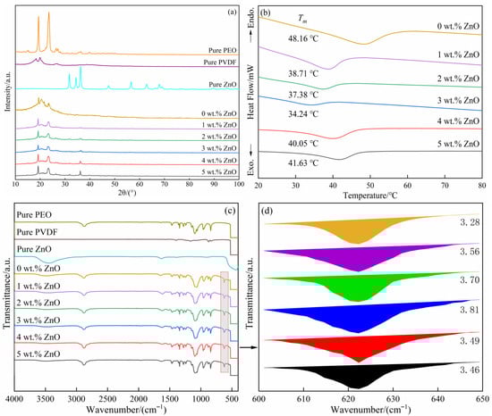 XRD patterns (a) of the SPEs (0 wt.% ZnO [], 1–5 wt.% ZnO), and three pure substances (PEO, PVDF, and ZnO) []; DSC curves (b) of the SPEs (0 wt.% [], 1–5 wt.%); FTIR spectra (c) of the SPEs (0 wt.% [], 1–5 wt.%) and three pure substances (PEO, PVDF, and ZnO) []; and the local magnification (d) of the SPEs (0 wt.% ZnO [], 1–5 wt.% ZnO).