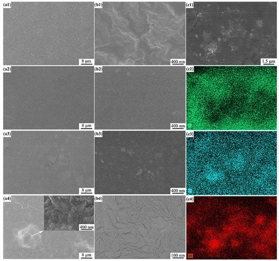 SEM images of the SPEs: (a1,b1) 0 wt.% ZnO [], (a2,b2) 1 wt.% ZnO, (a3,b3) 3 wt.% ZnO, and (a4,b4) 5 wt.% ZnO, and the SEM image and the corresponding energy dispersive spectroscopy mapping images of the SPE with 5 wt.% ZnO: (c1) SEM image, mapping images of (c2) C, (c3) O, and (c4) Zn.
