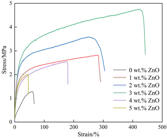 Stress–strain curves of the SPEs (0 wt.% ZnO [], 1–5 wt.% ZnO).