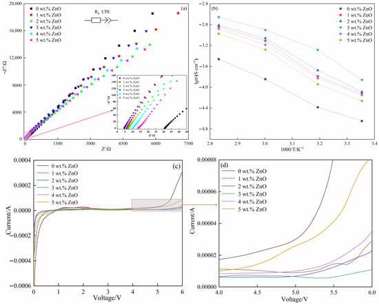 EIS and the local magnification (inset) of the SPEs (0 wt.% ZnO [], 1–5 wt.% ZnO) in the symmetrical coin cells (SS (stainless-steel sheet)/SPE/SS) at 60 °C (a); Arrhenius plots of the SPEs (0 wt.% ZnO [], 1–5 wt.% ZnO) in the symmetrical coin cells (SS/SPE/SS) at 20 °C, 40 °C, 60 °C, and 80 °C (b); and electrochemical windows (c) of the SPEs (0 wt.% ZnO [], 1–5 wt.% ZnO), and the local magnification (d) of the SPEs (0 wt.% ZnO [], 1–5 wt.% ZnO) in the asymmetrical coin cells (Li (lithium sheet)/SPE/SS) at 60 °C.