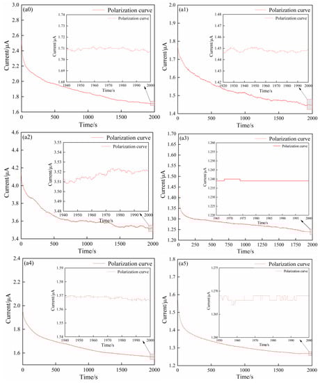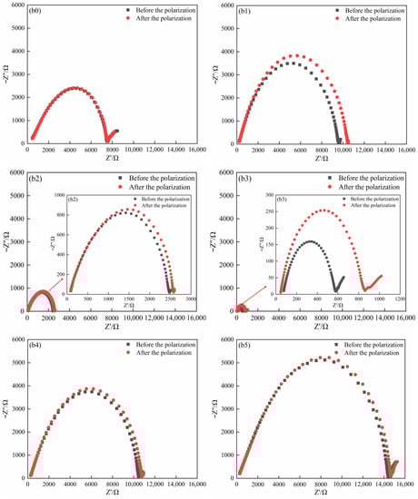 Polarization (a0–a5) and EIS curves (b0–b5) of pre-polarization and post-polarization of the SPEs in the symmetrical coin cell (Li (lithium sheet)/SPE/Li) at 60 °C, (a0,b0) 0 wt.% ZnO [], (a1,b1) 1 wt.% ZnO, (a2,b2) 2 wt.% ZnO, (a3,b3) 3 wt.% ZnO, (a4,b4) 4 wt.% ZnO, and (a5,b5) 5 wt.% ZnO.