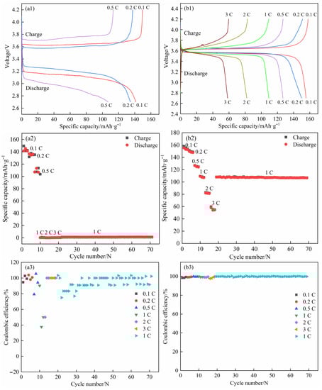 The rating performance of LFP/SPEs/Li coin cells at 60 °C. (a1–a3) Zero wt.% ZnO [], (b1–b3) 3 wt.% ZnO.