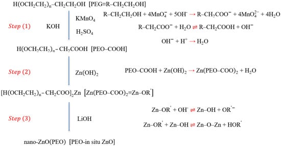 ZnO was in situ prepared (Scheme 1): hydrocarbyl was oxidized into carboxyl in PEG (Step 1), H in carboxyl of PEG was replaced by Zn (Step 2), and Zn was further transformed into ZnO (Step 3).