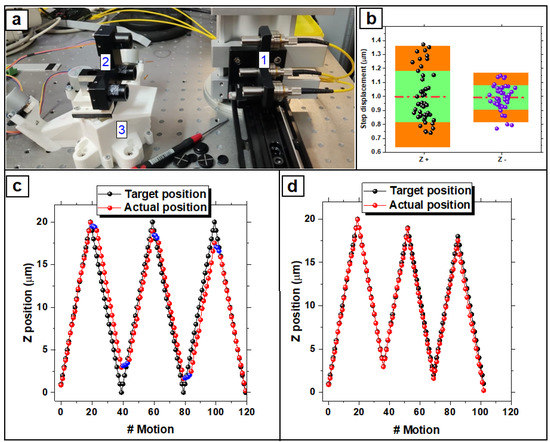 The calibration of the translation stage was performed by actuating 20 displacements of 1 μm forward and backward, repeating this sequence 3 times (Figure 3c). This procedure was conducted to evaluate the actual displacement for each single step and the systematic error of positioning for each directional change in order to correct the deviation due to the backlash. The bidirectional systematic positioning deviation was defined as [37]: