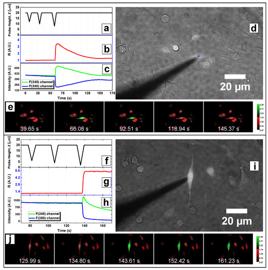Single-cell microindentation of Piezo1-A1 cells: the changes of intracellular Ca2+ concentration are monitored using ratiometric fluorescence microscopy; examples of a responsive (a–e) and an unresponsive cell (f–j) are reported. Cell-indenter glass probe is initially positioned above (h0 = 20 μm) cell adhesion plane. Thus, deeper and deeper vertical displacements are actuated (a,f) until contact with cell membrane. Fluorescence intensity in respect to the excitation wavelengths of 340 nm and 380 nm is averaged over the intracellular area, and displayed in a plot of the fluorescence ratio R (b,g) or a channels plot (c,h). Both responsive and unresponsive cells are indented until membrane rupture occurs, resulting in a plateau in the R plot. Before the disruptive indentation, the cell presents a transient peak in R signal (b) with tFWHM~40 s (responsive). On the other hand, when no increase in the trace of R is observed before the plateau, i.e., the membrane rupture, cell is classified as unresponsive (g). The initial positioning of the probe requires a tip position visualisation: bright-field microscopy is used to monitor the shadow of the tip (d,i), which can be moved above cell area through horizontal displacements of the probe. Fluorescence ratio R is imaged (Supplementary Videos S1–S2) on five representative color-coded frames displaying the peak of a responsive cell € and the plateau of a ruptured unresponsive cell (j).