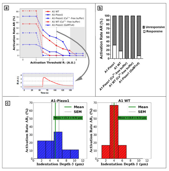 As previously anticipated, we found that activation events could be associated with the indentation imposed on the cell. In fact, the activation-triggering probe displacement D was translatable to cell indentation depth δ, as seen in Equation (1). Based on this consideration, we can also plot the activation rate ARδ (% of responsive cells) as a function of the indentation depth δ. Figure 6c shows this representation for A1-Piezo1 and A1 WT cells.