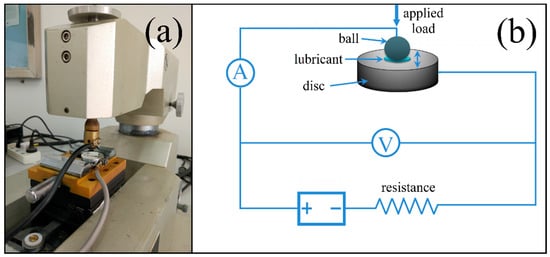 The current-carrying tribological tests were achieved on a friction apparatus (MFT-R4000). Figure 1 gives the picture and schematic diagram of the friction apparatus. The current and voltage of the friction interfaces was monitored and recorded in live time during the friction process. The upper ball (diameter, 5 mm) slid against the lower disc (20 mm × 20 mm × 5 mm) with a frequency of 2 Hz and an amplitude of 5 mm. The ball and disc were all made of copper (CuZn40, purity, >99.99%, hardness, 100–120 Hv). The load and voltage was set as three combinations including 5 N–500 mV, 5 N–1500 mV, and 20 N–1500 mV. All the discs and balls were polished with diamond paste to acquire a surface roughness of about 0.05 μm. The relative humidity and temperature was 30% and 25 °C, respectively. Before each tribological test, the balls and discs were ultrasonically washed with acetone for 10 min and then the friction region was filled with about 0.5 g lubricant. The curves of the coefficient of friction (COF) were recorded and every tribological test was repeated three times to ensure the accuracy of the experimental data. After the friction test, the electrical contact resistance (ECR) and the standard deviation (SD) of COFs and ECR were calculated, respectively.
