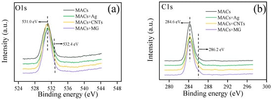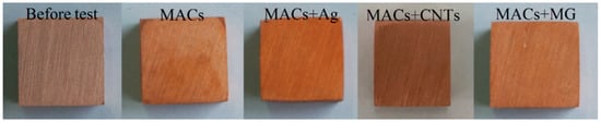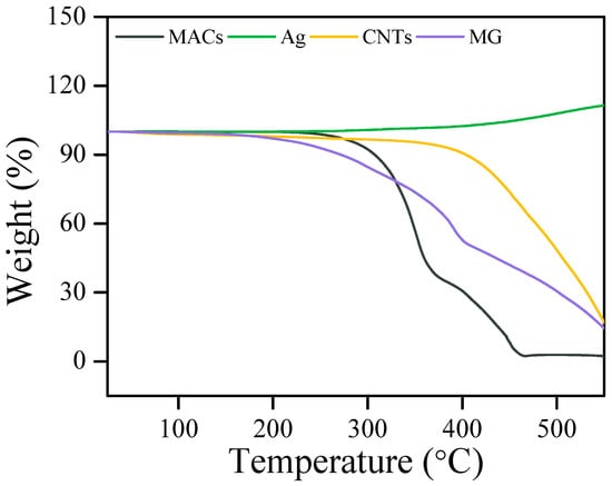 The TGA curves of MACs and additives are shown in Figure 2. MACs have a decomposition temperature of approximately 285 °C. Ag has a slowly increasing mass from about 300 °C, indicating that Ag is oxidized under a relatively high temperature. CNTs and MG start to decompose at about 220 °C, which is attributed to the pyrolysis of the carbon backbone and the removal of labile oxygen-containing functional groups [,]. In some severe cases, electrical contacts can have a temperature as high as 150 °C [,]. Herein, all the samples exhibited good thermal stability to meet the requirement because they have a decomposition temperature higher than 200 °C.