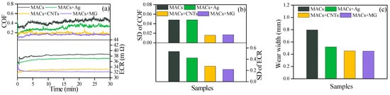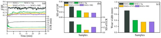 Figure 6 gives the experimental results under 20 N and 1500 mV at 2 Hz. As can be seen from Figure 6a, MACs containing additives all reduced the COF by more than 40% compared with MACs. However, Figure 6b shows that Ag exhibited a higher SD value of COF than others, indicating the friction was not stable. CNTs and MG in MACs exhibited low and stable ECR, indicating good conductive and friction reduction abilities. Figure 6c depicts that MACs containing CNTs or MG had lower wear widths than pure MACs and MACs + Ag, demonstrating a superior wear-resistant property.