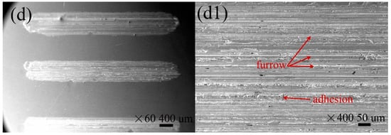 To study the conductive and tribological mechanisms of these additives, several surface characterizations were employed. The morphologies of the worn surfaces under the lubrication of different lubricants were obtained by an SEM (Figure 7). The worn surface (Figure 7a,a1) lubricated by pure MACs was wider and rougher. There were a lot of deep furrows and spalling dominated by abrasive and fatigue wear on the worn surface, indicating severe wear was taking place under this condition. Figure 7b shows that Ag did not significantly reduce the wear widths. Figure 7b1 suggests that the worn surface lubricated by MACs + Ag had some shallow grooves and adhesion regions, which may be due to the abrasive wear and Ag particles depositing on the worn surface. Figure 7c,c1,d,d1 shows that the addition of CNTs or MG in MACs can reduce the wear widths and make the worn surfaces smoother, as compared with pure MACs, exhibiting an outstanding wear-resistance ability.