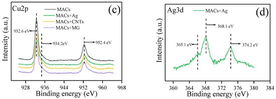 XPS of the typical elements on the worn surfaces under lubrication of MACs in the absence and presence of additives under 20 N and 1500 mV at 2 Hz. (a) the XPS curve of O1s, (b) the XPS curve of C1s, (c) the XPS curve of Cu2p, (d) the XPS curve of Ag3d.