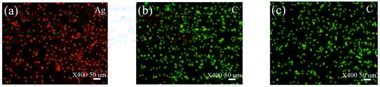 The chemical state of elements on the worn surface is crucial to understanding the conductive and lubricating mechanisms; therefore, XPS is employed and Figure 8 gives the XPS spectra of O1s, C1s, Cu2p, and Ag3d. The XPS of O1s (Figure 8a) has two peaks at 531.0 eV and 532.4 eV, which belong to carbon oxides and copper oxides [,]. The C1s peaks at 284.6 eV and 286.2 eV shown in Figure 8b belongs to –C-C, –C-H and –C-O bonds, which are identified as derived compounds the from the lubricants []. Figure 8c depicts that the XPS spectra of Cu2p has peaks at 932.6 eV, 952.4 eV and 934.2 eV. Combining the XPS peaks of O1s, it can be inferred that there are metallic copper and copper oxides on the friction surface [,,]. Figure 8d depicts the XPS spectra of Ag3d having sharp peaks at 368.1, 365.1 eV and 374.2 eV, which are assigned to Ag [,]. Combining the TGA result that Ag is oxidized under a high temperature of about 300 °C, it can be confirmed that metal Ag is deposited on the copper worn surface to enhance the conductive and lubrication performances. Figure 9 gives the EDS surface distribution images of Ag and C elements on the copper worn surfaces. It can be seen that Ag or C elements achieved high-density coverage on the copper worn surface. Under the action of pressure, solid additives can fill in the valley of surfaces and deposit on the friction surface to increase the contact area, which can reduce friction and wear. EDS characterization of the worn surfaces further provides direct evidence for the generation of a deposited lubricating film on the worn surface. XPS and EDS analysis show that a protective film is formed on the copper worn surface, which enhance the conductive and tribological behaviors throughout the friction test.