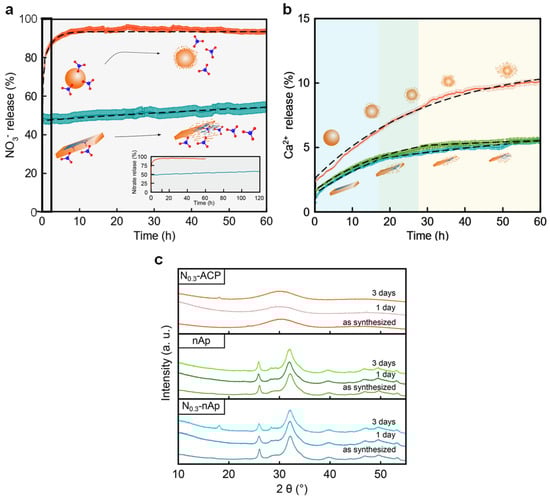 A similar finding was observed for biomimetic calcium phosphate nanoparticles prepared by wet chemical precipitation using only carbonate ions as an additive and Ca(NO3)2 and KNO3 as nitrate sources. In this case, while fully amorphous calcium-phosphate nanoparticles precipitated after 5 min of reaction with a 2.12% content of nitrate (weight basis), a nanocomposite made by ACP and nanocrystalline apatite was formed after 24 h of maturation time with a 0.44 % of nitrate [26]. A joint analysis of WAXTS and SAXS data indicated that the nanocomposite showed a nano-apatite-ACP core-crown arrangement, as it has also been suggested for biological apatite nanoparticles in bone [17]. Interestingly, WAXTS analysis revealed that the increase of the concentration of NO3− precursors led to progressive c-axis expansion coupled with a concomitant a-axis contraction, which was attributed to the different amounts of nitrate incorporated as substitutional defects. This hypothesis was later corroborated by the nutrient release/dissolution profile (Ca2+, NO3−) shown by the nanoparticles when suspended in water (Figure 3a,b). Although a first burst NO3− release was observed, associated with the anions weakly adsorbed to the amorphous crown, the nanocomposites showed a progressive nitrate release kinetic over (at least) 60 h. More interesting, the kinetic nitrate release profile was parallel to core-particle dissolution, confirming the incorporation of nitrate ions in the nanocrystalline structure. By contrast, the NO3− kinetic profile from N-doped ACP was much faster than the amorphous nanoparticle dissolution, with a cumulative nitrate delivery of 94.2% after 10 h. In this regard, PXRD (Powder X-ray Diffraction) analysis certified that the amorphous nature of the nanoparticles was maintained during at least 60 h (Figure 3c), ruling out that ACP-to-nAp transformation elicits the nutrient release. Consequently, the nitrate-release process must be largely governed by the desorption of the dopant from the ACP particle surface, much more important than that generated by core particle degradation.
