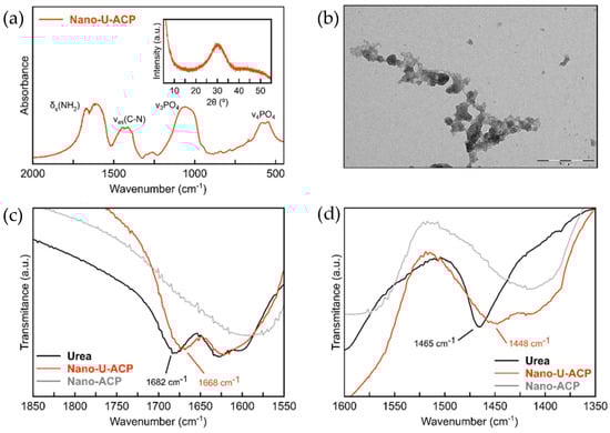 (a) FTIR and PXRD of Nano-UACP, (b) TEM-images of NanoU-ACP nanoparticles showing spheroidal morphology, (c,d) FTIR spectra of Urea (black curve), Nano-U-ACP (red curve), and non-functionalized ACP (Nano-ACP, grey curve) in the regions of wavenumber from 1850–1550 cm−1 and 1600–1350 cm−1, respectively. The shift observed in the vibration mode assigned to the urea for the material Nano-U-ACP and pristine urea indicating the main Ca-NH2 interactions are highlighted. “Reprinted with permission from Ref. [56]. 2021, Springer Nature”.