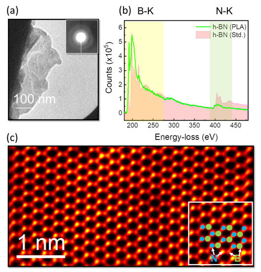 - Arenal, R.; Kociak, M.; Zaluzec, N. High-angular-resolution electron energy loss spectroscopy of hexagonal boron nitride. Appl. Phys. Lett. 2007, 90, 204105. [Google Scholar] [CrossRef] [Green Version]