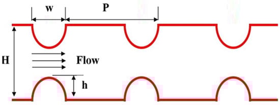 The channel considered by Togun [] is adopted to create duct geometry, as presented in Figure 1. The total length of the channel is 1000 mm and the height of H = 40 mm, with semicircle ribs on the wall at 2.5 mm and 5 mm step heights with spacing ranging from 5 to 10 mm. In this analysis, six cases were applied with pitch ratios ranging from 10 to 40 for 2.5 mm rib height and 5 to 20 for 5 mm rib height; for more details, see Table 1. With water as the base fluid, four hybrid Al2O3-Cu/water nanofluids with solid volume fractions of 0.33, 0.75, 1, and 2% were considered. For a constant wall temperature of 320 K, the flow Re numbers varied from 10,000 to 25,000. The heat transfer characteristics of hybrid nanofluids were defined using the single-phase model.