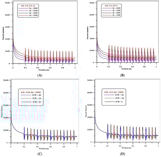 (A) Distributions of Nusselt number with different Reynolds numbers of h/H = 0.12 and P/W = 10. (B) Distributions of Nusselt number with different Reynolds numbers of h/H = 0.12 and P/W = 5. (C) Influence of pitch ratio on Nusselt number for h/H = 0.06 at Re = 25,000. (D) Influence of pitch ratio on Nusselt number for h/H = 0.12 at Re = 25,000.