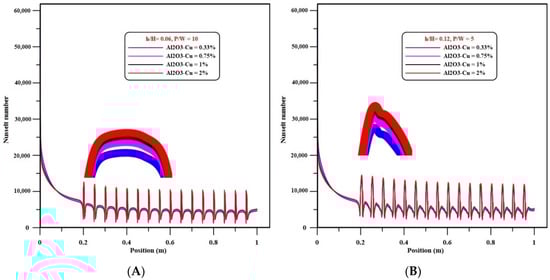 (A) Variations of Nusselt number with different hybrid nanofluids of Al2O3-CuO at h/H = 0.06 and P/W = 10. (B) Variations of Nusselt number with different hybrid nanofluids of Al2O3-CuO at h/H = 0.12 and P/W = 5.
