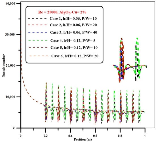 In Figure 5, all cases of current investigations are potted for different step heights of ribs and pitch space at a Re number of 25,000 and 2% solid volume fraction of hybrid nanofluids. In general, the results showed that for all pitch spaces, the local Nu number with a step height of 5 mm (h/H = 0.12) is higher than with a step height of 2.5 mm (h/H = 0.06) due to a rise in rib height. Increases in the number and size of ribs resulted in the greatest improvement in Nu number due to increases in the number and size of the recirculation zones, which significantly impacts thermal efficiency.